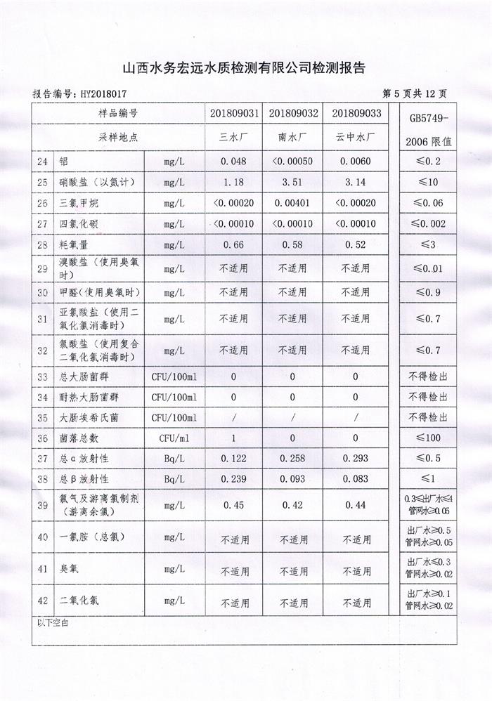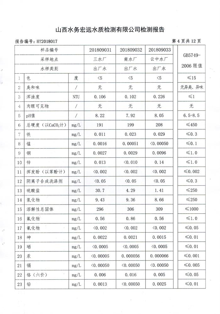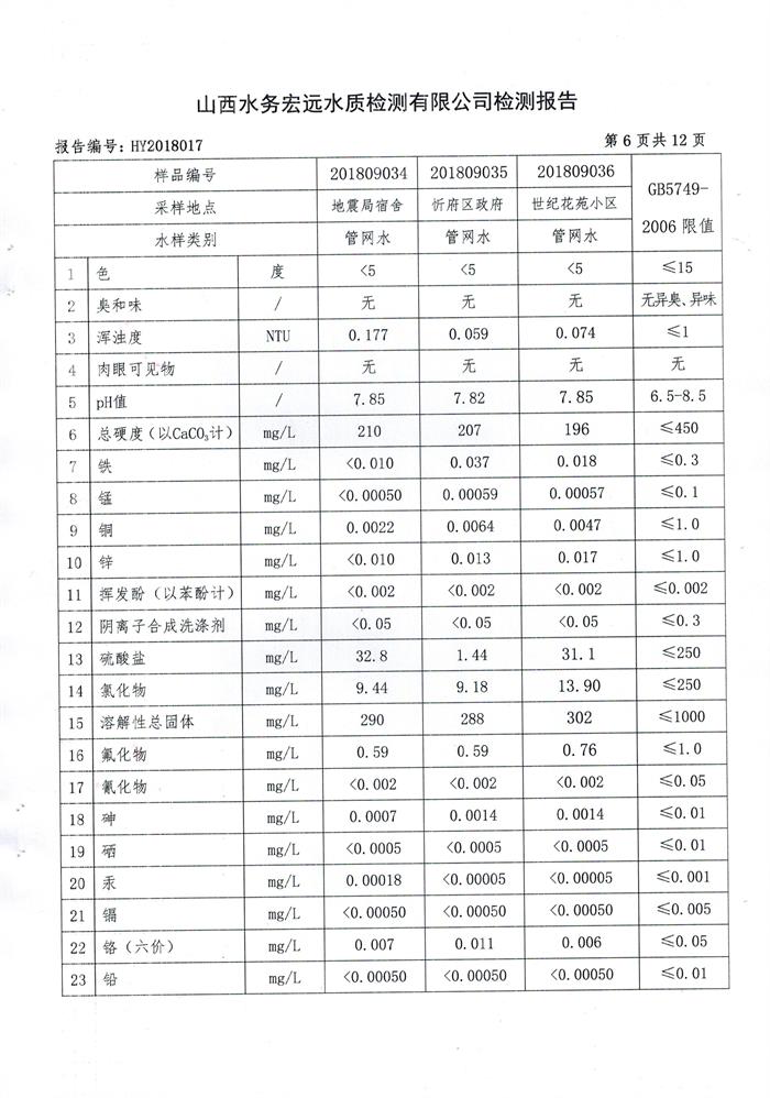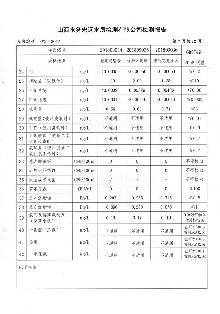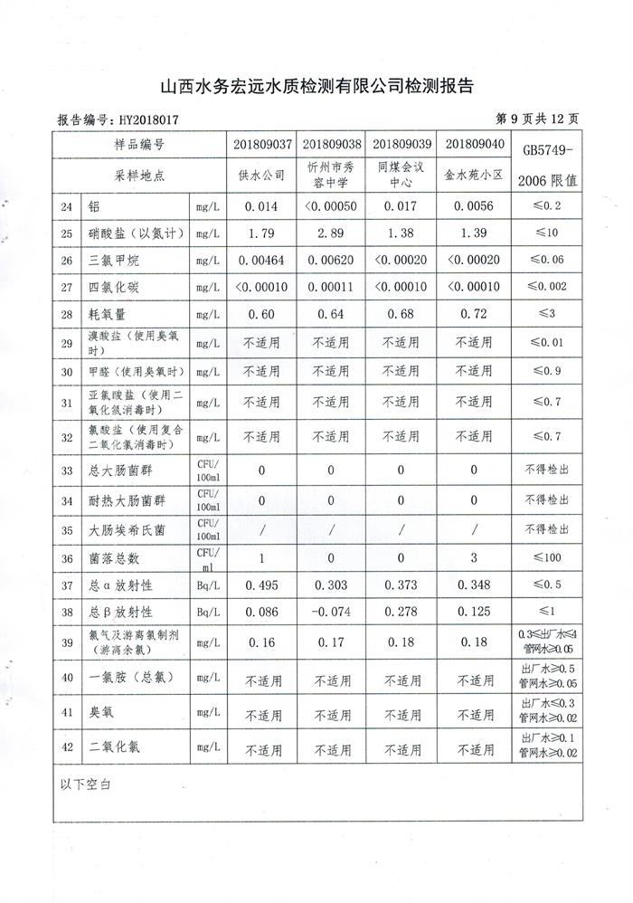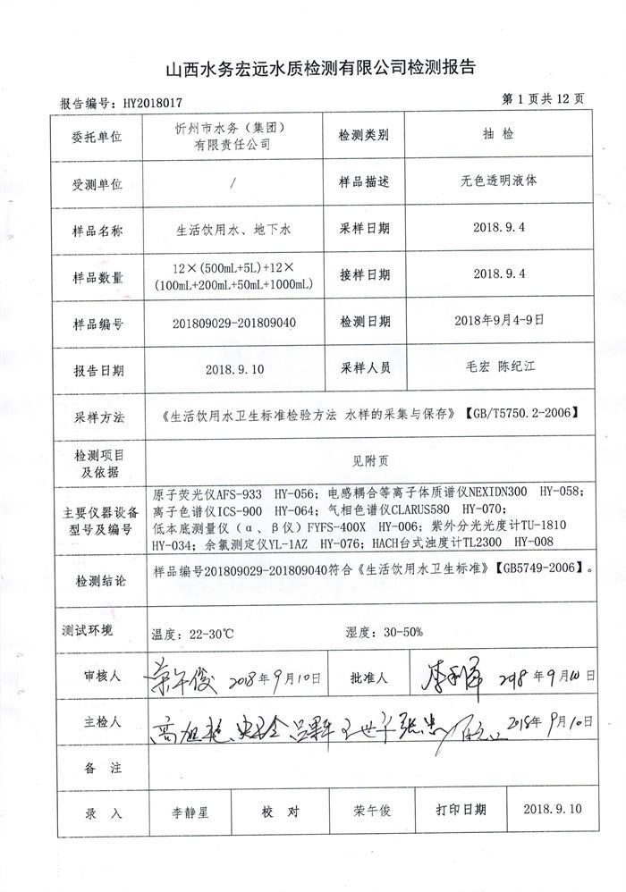 忻州城區(qū)公共供水水源水、出廠水、管網(wǎng)水、管網(wǎng)末梢水2018年9月份水質(zhì)信息公示