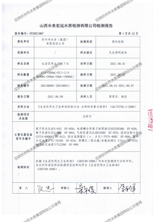 忻州城區(qū)公共供水水源水、出廠水、管網(wǎng)水、管網(wǎng)末梢水2021年6月份水質(zhì)信息公示